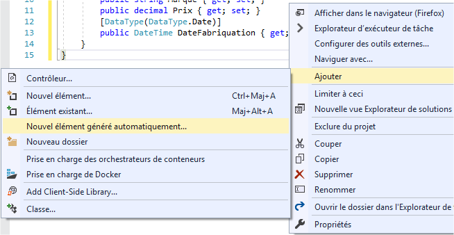 Dans le dossier "Voitures" ajoutez un nouvel élément de type "Vue Razor"